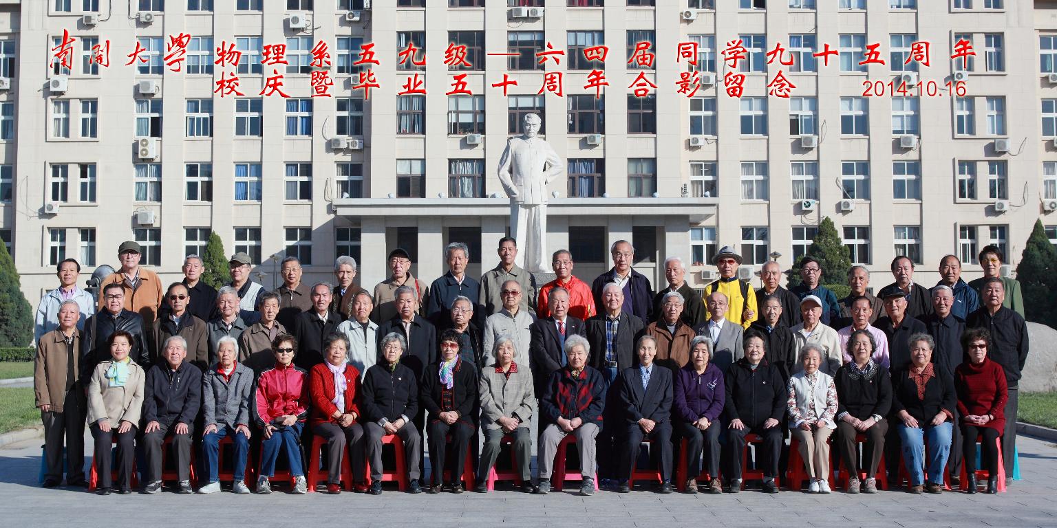 2014年10月15日天高云淡、秋风送爽。母校色中色 热情欢迎着来自四面八方的南开校友。为了欢庆95周年校庆暨毕业50周年的物理系59级—64届的老校友们,虽然不少人满头白发、满脸沧桑,已经70多岁,但个个神采奕奕,急切地向着明珠园大厅的报到处走去。大厅内洋溢着老同学们相聚的欢声笑语,握手、拥抱,彼此有说不完的问候和知心话,如同又重新回到了五十年前的大学时代。