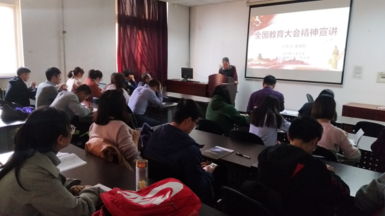 正值第一届全国教育大会召开后的一个多月时间,2018年10月29日上午,学院党委副书记赵爽老师在三教104教室向全体2016级硕士党员传达了关于全国教育大会的精神,内容包括:总结习近平总书记在全国教育大会上关于工作目标、节日问候、十九大部署、十八大以来成绩以及新思想新理念新观点的9个坚持的讲话精神。此外,为了更好地落实“全方位、全员、全过程”的育人方针,借此机会,赵老师与在座的各位学生党员进行了亲切地交谈。在交谈中,大家无所不言,这其中有关于教、学、研等方方面面的整改意见,也有“公”与“能”的风向建议,同时老师们也认真详细地收集了学生们提出的意见。