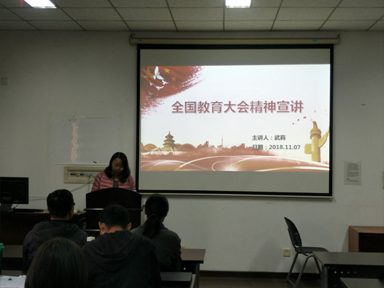 2018年11月7日2017级硕士第二党支部和凝聚态教工支部共同聆听了党委委员武莉老师讲的题为《全国教育大会宣讲》的党课。