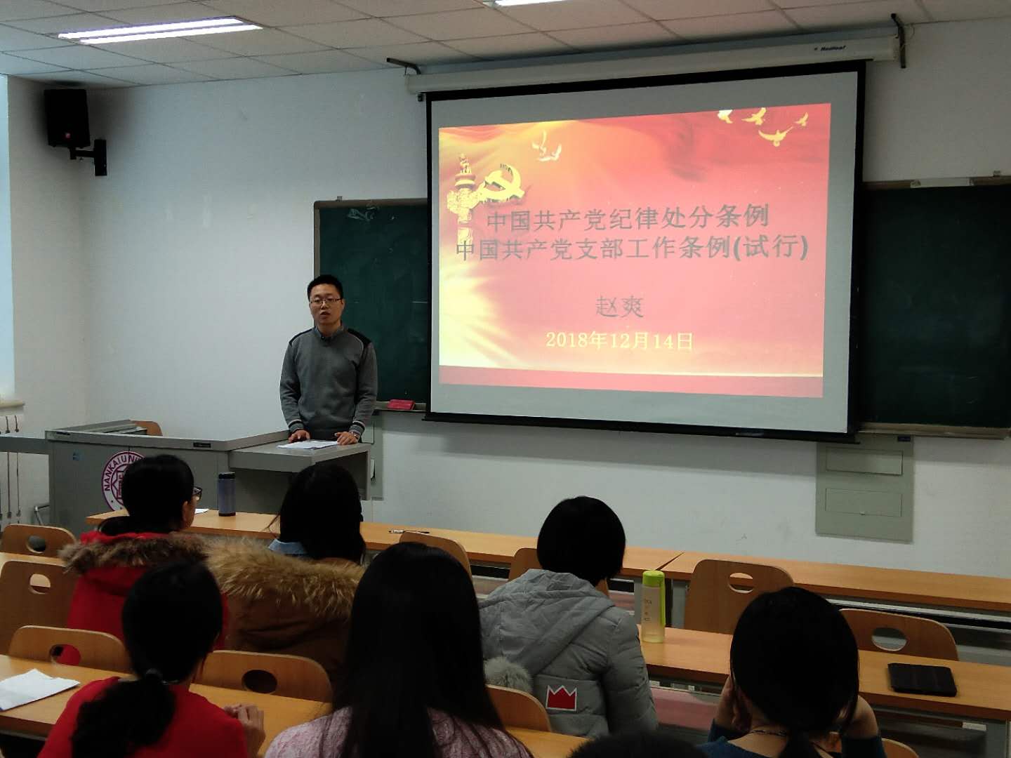 12月14日,色中色 学生党总支在三教105进行集中理论学习,专题学习《中国共产党纪律处分条例》和《中国共产党支部工作条例(试行)》。学生党总支书记赵爽主持并领学,学生党总支委员、学生党员参加本次学习。