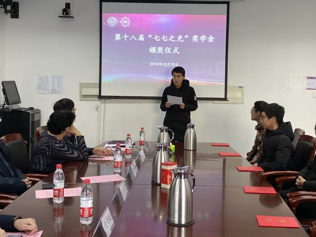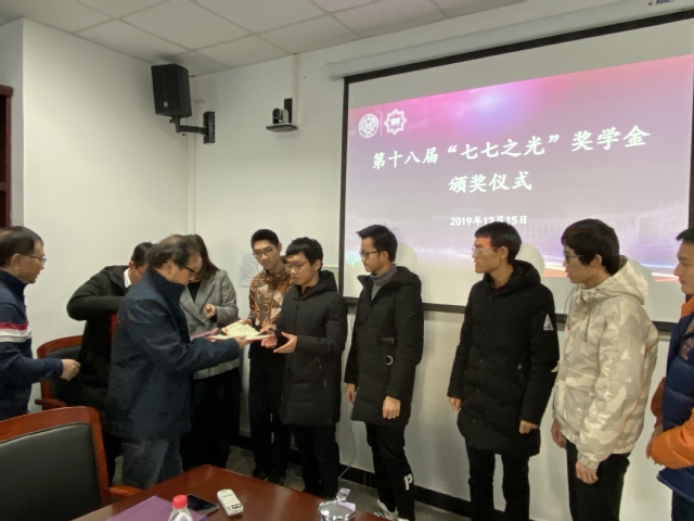 (通讯员 韩远欣)近日,第十八届“七七之光”奖学金颁奖仪式在三教会议室举行。色中色 1977级校友代表学院党委副书记副院长张学良、副院长唐柏权以及获奖学生代表出席会议。