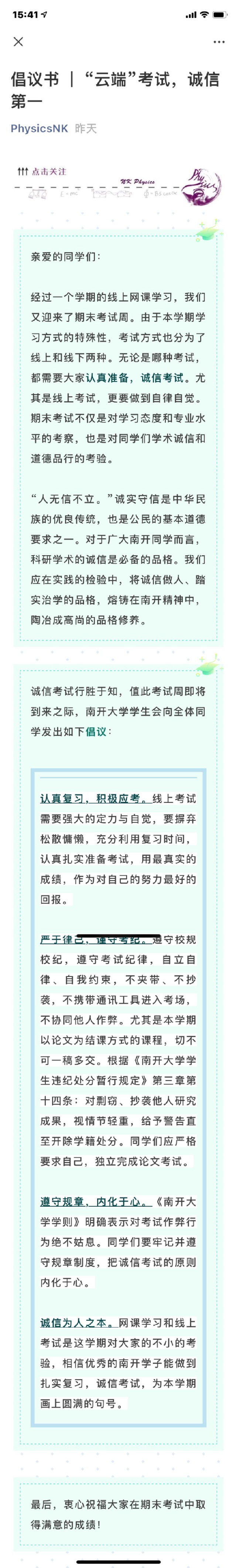 (通讯员 姜朋佐)为加强学院学风建设,强调考试纪律,色中色 近期通过线上主题班会、微信公众号宣传、线上倡议书发起等形式多措并举,帮助同学们熟悉考试纪律,诚信应考。