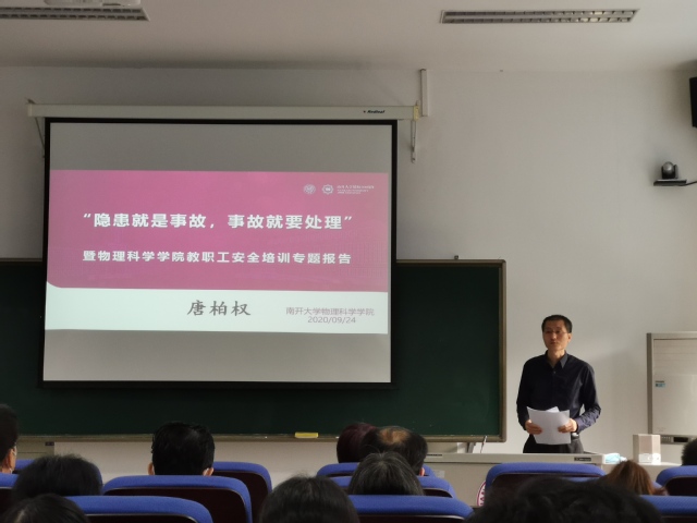 随后,学院分管副院长唐柏权从天津汇洋石油储运有限公司重大安全隐患事件的通报情况入手,对事故隐患问题、企业处理结果以及其他责任部门的处理结果进行了事件剖析。并通过对北交大爆燃事故、危险性操作事故、气体安全事故等典型案例的解读,进行安全警示,呼吁师生提高安全意识,确保自身安全,保护他人安全,维护学校安全稳定。