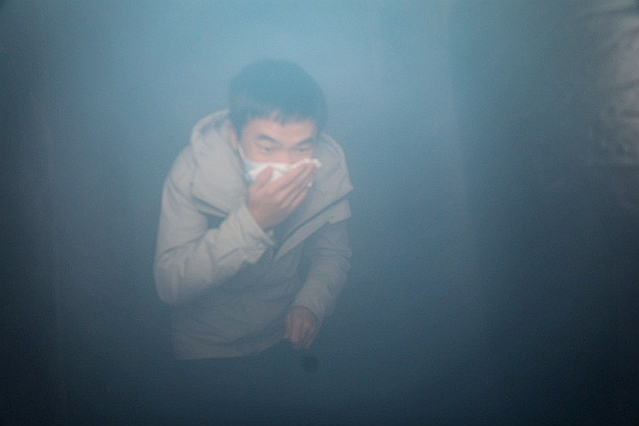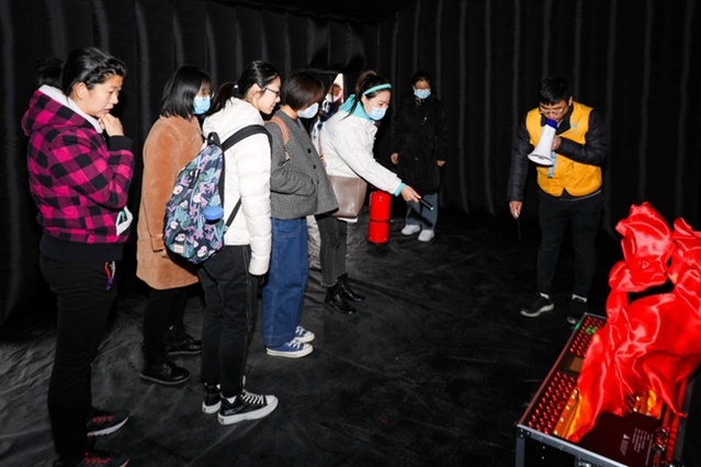 模拟消防疏散逃生体验,根据逃生指示标志,捂住口鼻、俯身前行,选择正确的通道逃离“火场”。