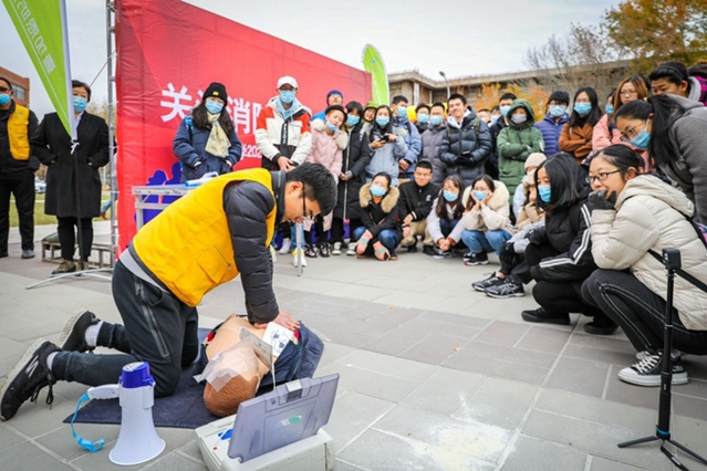急救实操观摩,借助假人帮助学习心肺复苏、人工呼吸、AED(自动体外除颤仪)的使用方法以及气道梗阻急救措施。