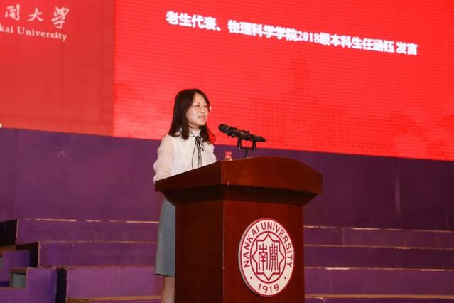老生代表、色中色 2018级本科生任涵钰分享了她在南开的学习生活,鼓励同学们勇敢逐梦、脚踏实地、智勇真纯。