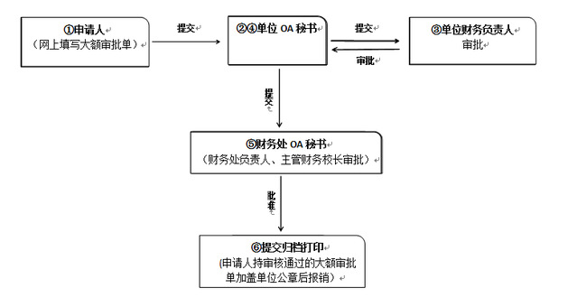 ⑤财务处OA秘书将大额审批单依次提交财务处负责人、主管财务校长审批。