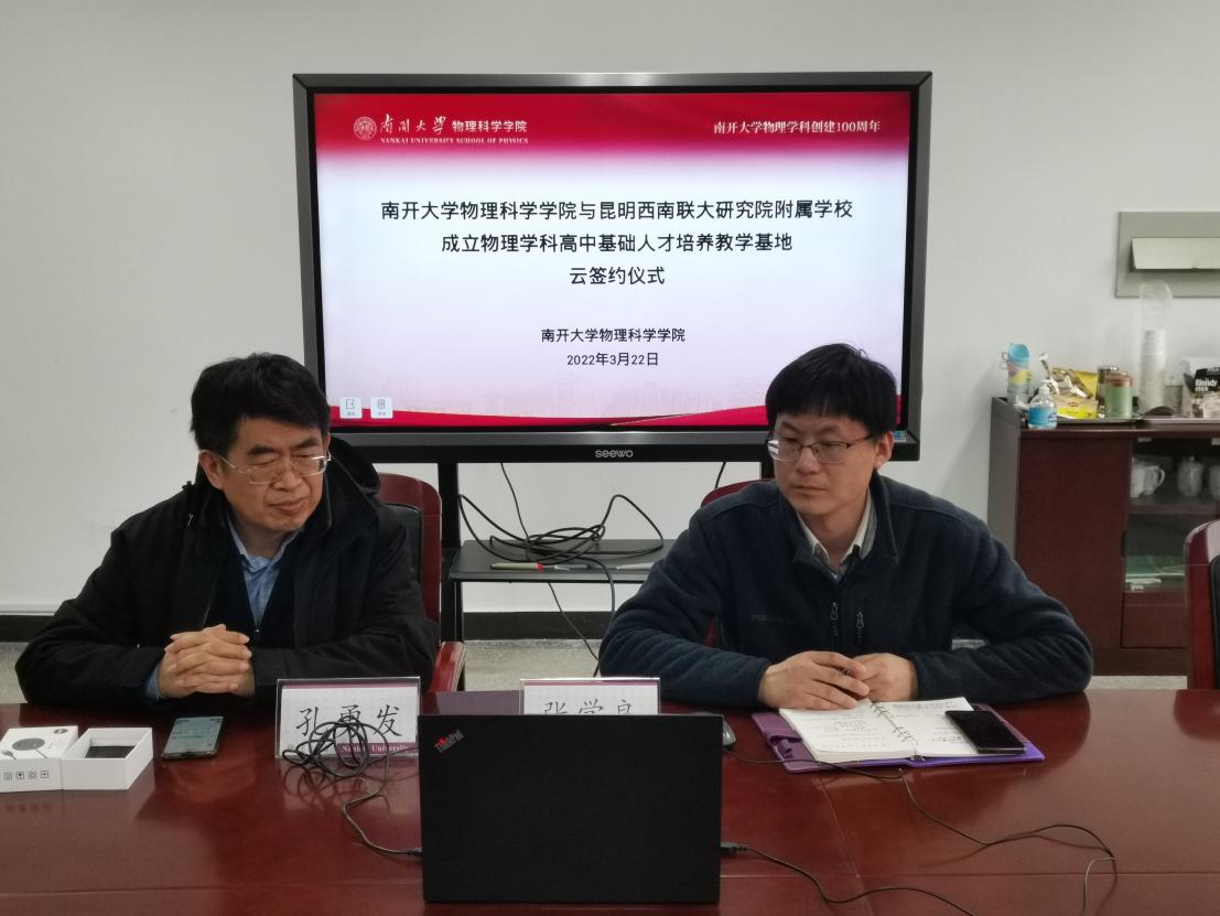 3月22日,色中色 与山东省泰山中学、昆明西南联大研究院附属学校举行了物理学科高中基础人才培养教学基地云签约仪式,色中色 院长张国权、山东省泰山中学党委书记、校长徐炳伦、昆明西南联大研究院附属学校校长周杰、物理学科高中基础人才培养与教学实践计划执行委员会主任吴雨浓出席会议,各单位教师代表共同参与。