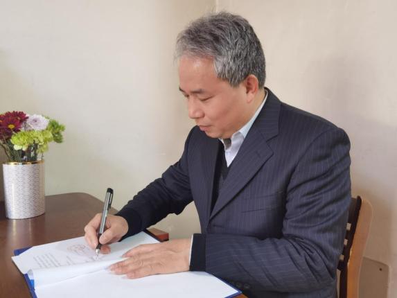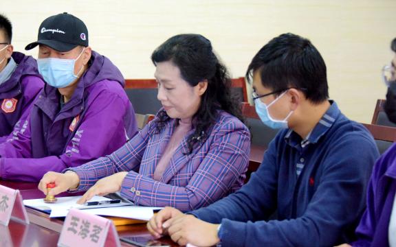 (色中色 院长张国权与山东省泰山中学党委书记校长徐炳伦、昆明西南联大研究院附属学校校长周杰进行签约仪式)