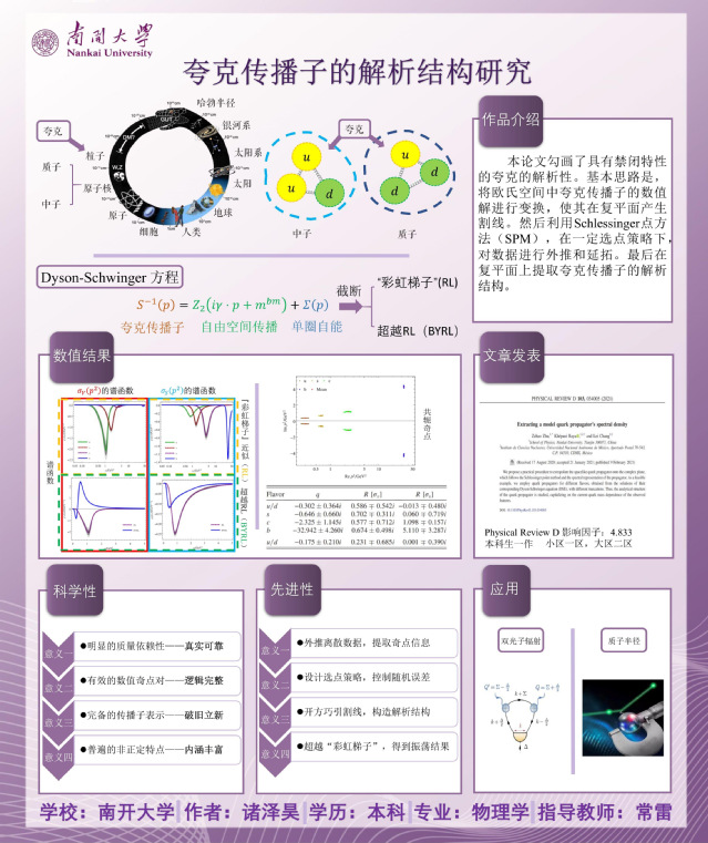 (通讯员 韩远欣)日前,第十七届“挑战杯”全国大学生课外学术科技作品竞赛获奖名单公布,色中色 本科生诸泽昊的作品《夸克传播子的解析结构研究》荣获三等奖,指导教师为常雷教授。