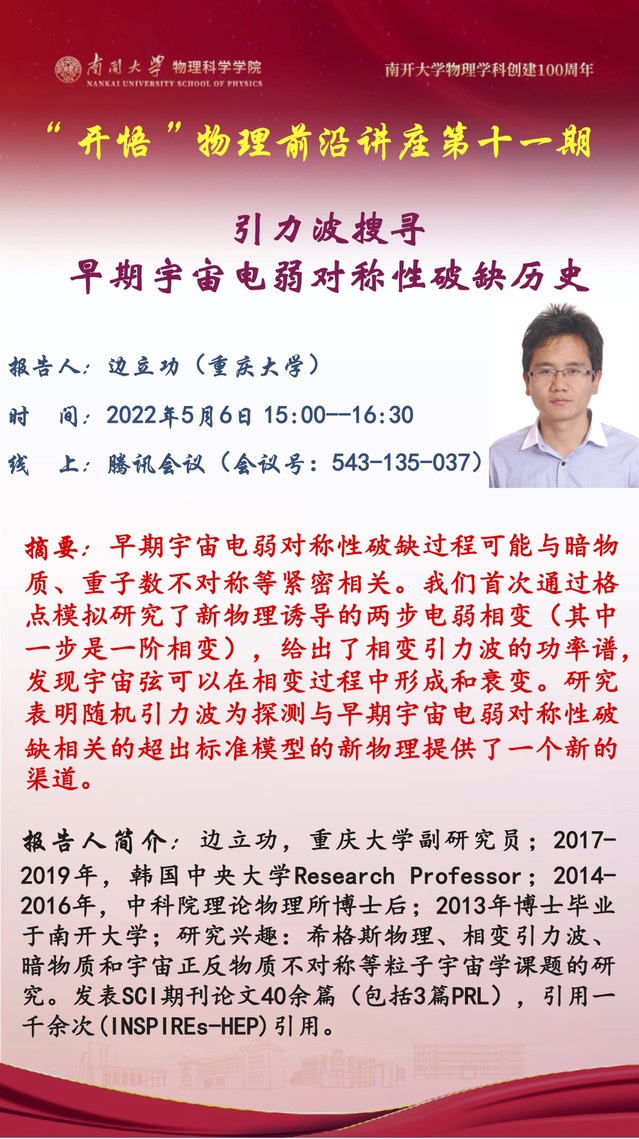 【“开悟”物理前沿讲座】(第 11 期)引力波搜寻早起宇宙电弱对称性破缺历史