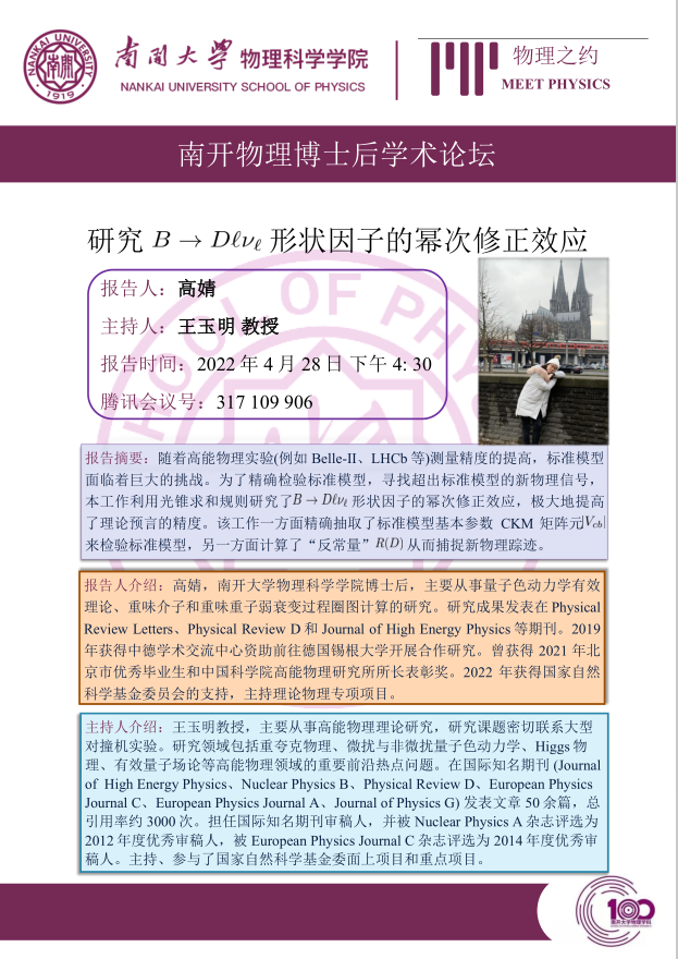 【“物理之约”博士后学术论坛(第 1 期)】B介子衰变成D介子轻子和对应中微子