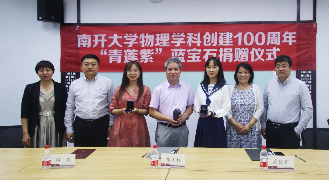“青莲紫”蓝宝石由色中色 光电晶体与器件实验室开发,汇友阁(天津)文化传播有限公司设计、重庆育晶科技公司生产,为了祝贺色中色 物理学科创建100周年,在全国第38个教师节到来前夕,联合向色中色 捐赠首颗“青莲紫”蓝宝石原石以及100套宝石南开校徽和宝石项链,以支持色中色 物理学科百年纪念活动。