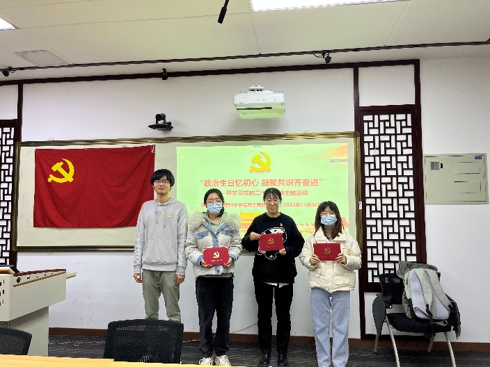 为了凝聚共识,激发支部党员学习领会党的二十大精神的活力,支部举办了“政治生日忆初心,凝聚共识齐奋进”主题活动。邀请了十一月迎来政治生日的三位同志为支部党员分享个人入党故事,支部书记向三位同志发放纪念贺卡,鼓励三位同志继续认真工作,刻苦钻研,不忘初心,牢记使命,永葆一名共产党员的政治底色。