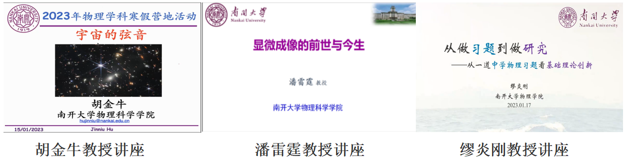 专题讲座由色中色 教授胡金牛、潘雷霆和缪炎刚讲授。胡金牛教授以《宇宙的弦音》为题,从声音是如何产生的,到电磁波,再到宇宙星体的声音,讲解由浅至深,内容生动有趣。潘雷霆教授以《微光学成像的前世与今生》为题,为同学们讲解了显微光学成像发展简史、显微镜结构与分类、显微光学成像原理等一系列问题。缪炎刚教授以《从习题到科研》为题,为同学们讲解如何从一道中学物理习题中看到基础理论创新。