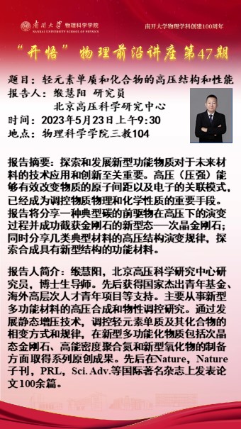 【“开悟”物理前沿讲座(第 47期)】轻元素单质和化合物的高压结构和性能