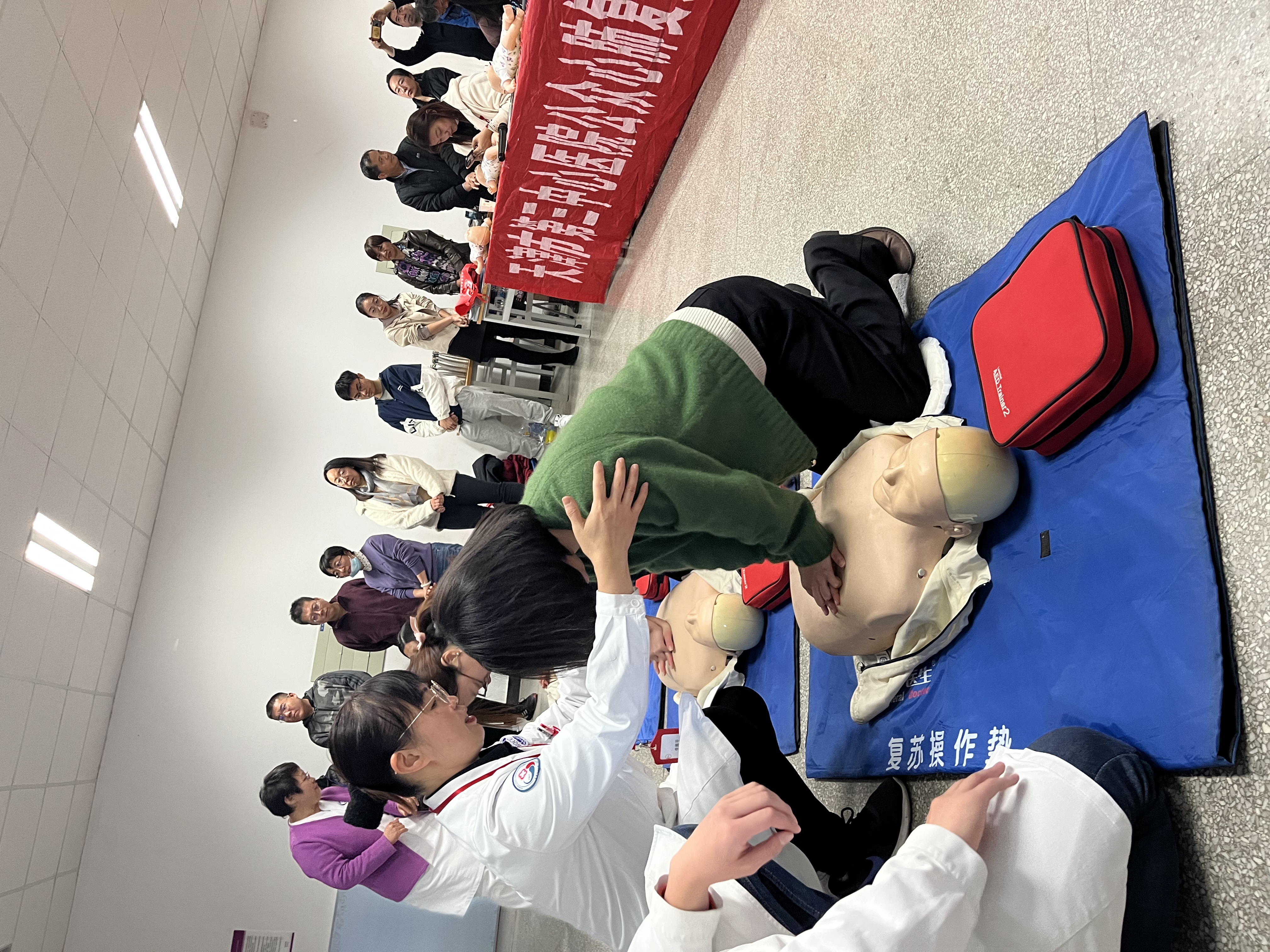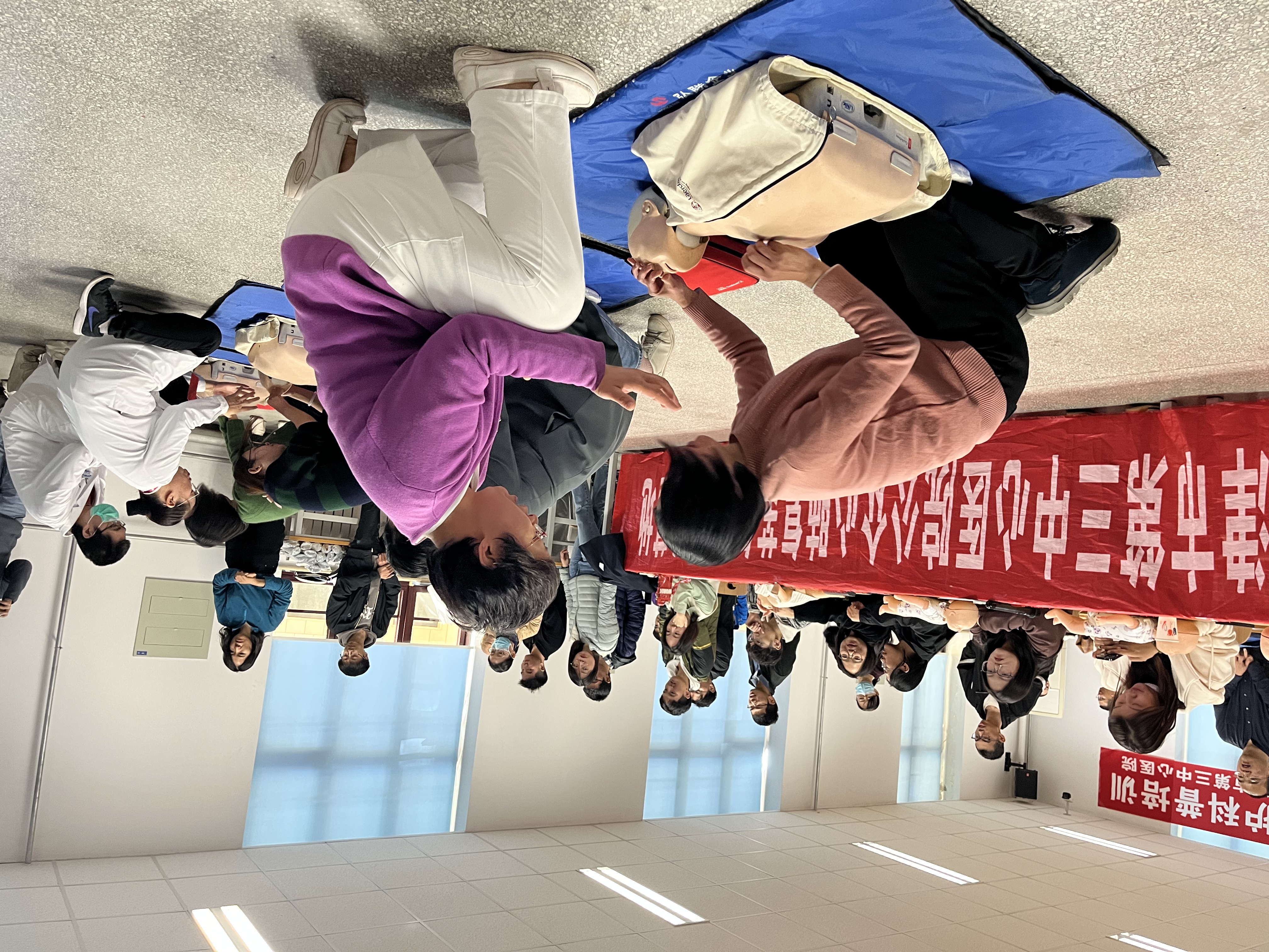 活动现场,三中心医院教学办公室主任黎俊首先详细介绍了心脏骤停的症状特性与心肺复苏急救重要性。随后临床技能实训中心负责人李雁平带领大家梳理了实施抢救的操作流程,以及自动体外除颤器(AED)使用方法、海姆立克急救技术的发力方式等。在接下来的实训环节,指导老师利用假人教具还原真实场景,现场分解演示,与会师生依次进行实际操作,每个人都亲身体会到急救的全过程和具体操作细节。急救团队老师从旁指导纠正动作,精彩的讲解和一对一的指导让大家获益匪浅。