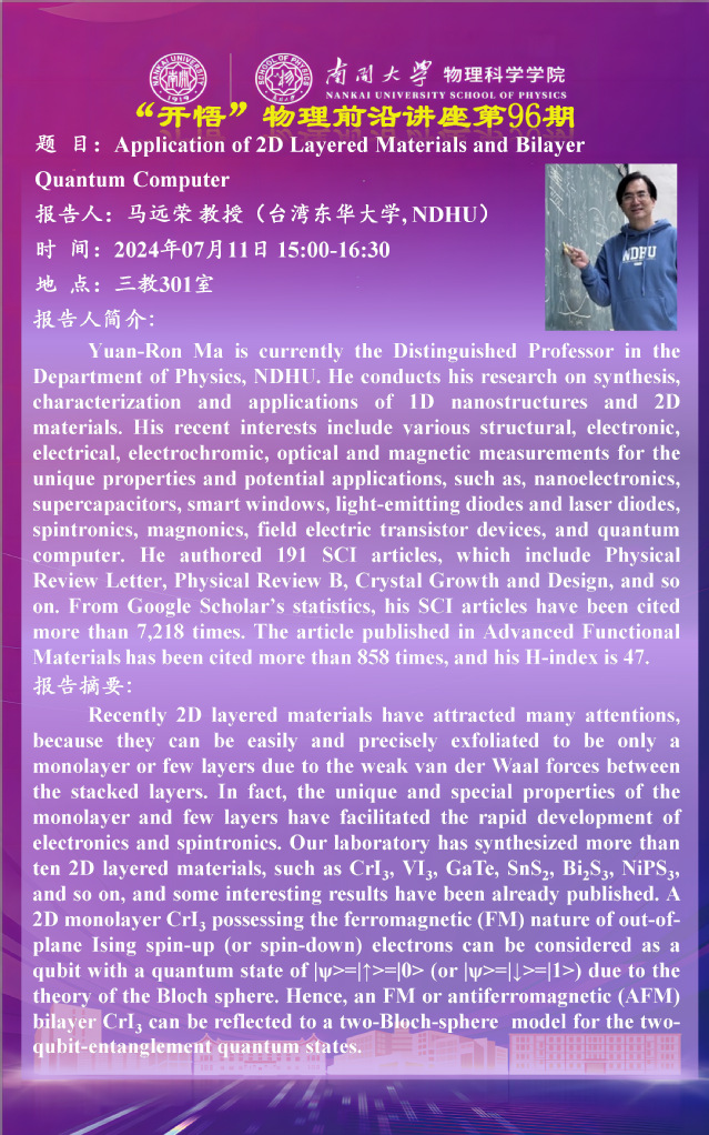 【“开悟”物理前沿讲座(第96期)】Application of 2D Layered Materials and Bilayer Quantum Computer