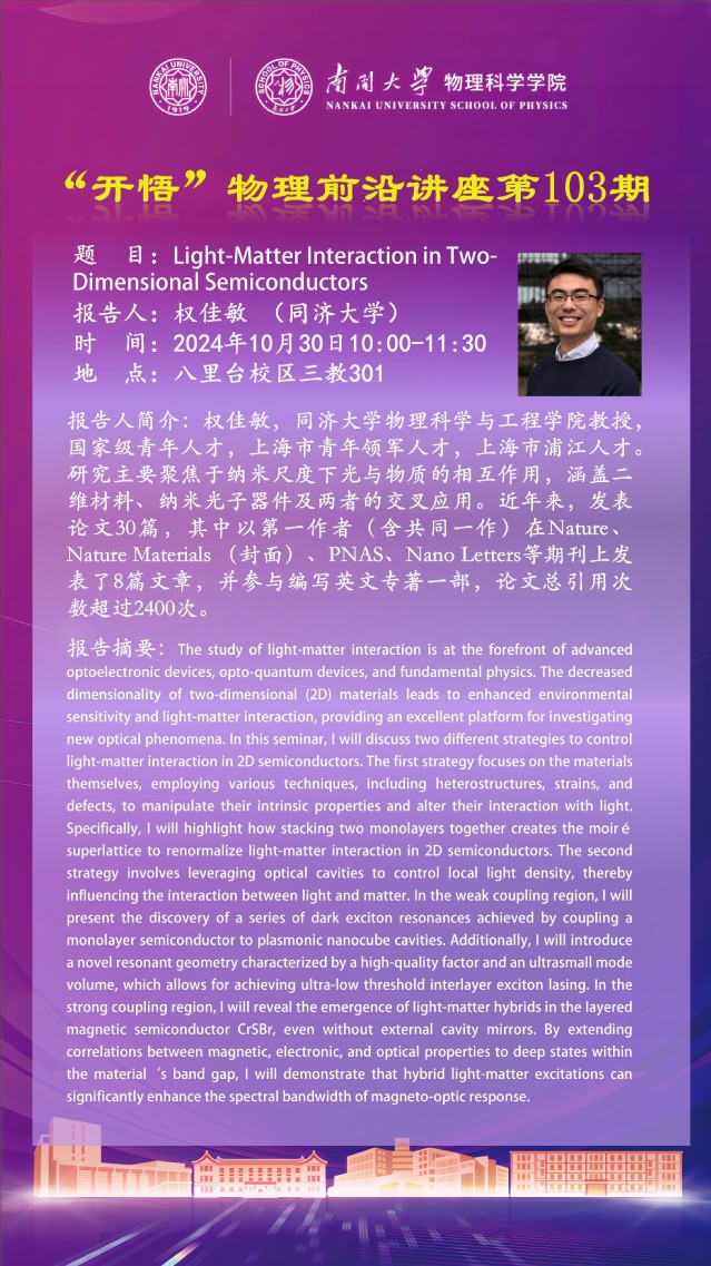 【“开悟”物理前沿讲座 (第103期)】Light-Matter Interaction in Two-Dimensional Semiconductors