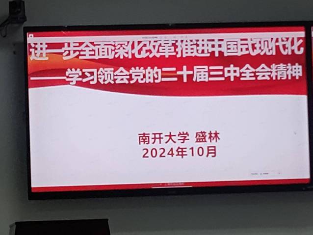 盛林教授从四个方面进行了生动的讲解:一是深刻认识党的二十届三中全会的时代背景与重大意义,二是党的二十届三中全会重要成果与要点解读,三是关于进一步全面深化改革的新思想、新观点、新论断,四是以进一步全面深化改革开放开辟中国式现代化广阔前景。