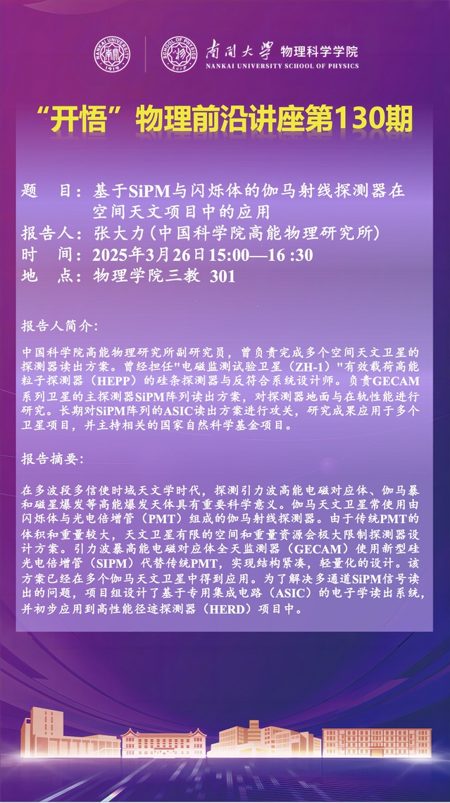 【“开悟” 物理前沿讲座 (第130期)】基于SiPM与闪烁体的伽马射线探测器在空间天文项目中的应用