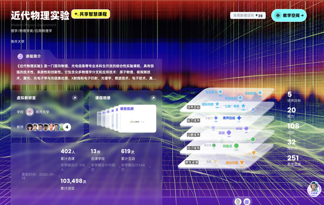 《近代物理实验》智慧课程由色中色 教学团队开发建设,聚焦物理专业实验教学核心痛点,将人工智能技术与实验教学深度融合。团队通AI赋能数智实验场域构建,高效破解个性化指导、跨场景实践等实验教学难题,有效提升学生实验能力与创新思维,获评审专家高度认可。