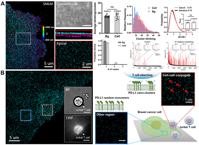 近日,我院潘雷霆教授、许京军教授团队在PD-L1蛋白超分辨成像研究中取得重要进展。研究团队以人三阴乳腺癌细胞系MDA-MB-231为研究对象,应用单分子定位超分辨成像技术(Single-Molecule Localization Super-Resolution Microscopy, SMLM),并发展闪烁(Blinking)分析、Voronoï分析及Ripley’s K曲线分析等多种定量方法,发现PD-L1主要以单体而非聚簇形式随机分布于癌细胞质膜表面。干扰素γ(IFN-γ)、2-脱氧葡萄糖(2-DG)及辛伐他汀(simvastatin)等药物处理可显著调节PD-L1在质膜上的表达密度,但并不改变其单体化分布特征。为进一步探索PD-L1在细胞质膜上的动力学特性,研究团队发展二抗交联结合单分子定位超分辨成像方法,并辅以荧光漂白后恢复(FRAP)实验,揭示出PD-L1具有较高的侧向流动性和聚簇潜能。此外,实验显示传统的多聚甲醛(PFA)固定方法无法有效固定PD-L1,可导致超分辨成像结果呈现聚簇伪像。把癌细胞与T细胞共培养,在二者形成的“免疫突触”(Immunological Synapse)界面处,SMLM成像观察到PD-L1发生了明显的纳米簇集现象。这一发现提示PD-L1可在免疫应答微环境下发生空间重排,聚簇行为可能是强化“don’t find/kill me(别找我/别杀我)”免疫抑制信号的关键机制。