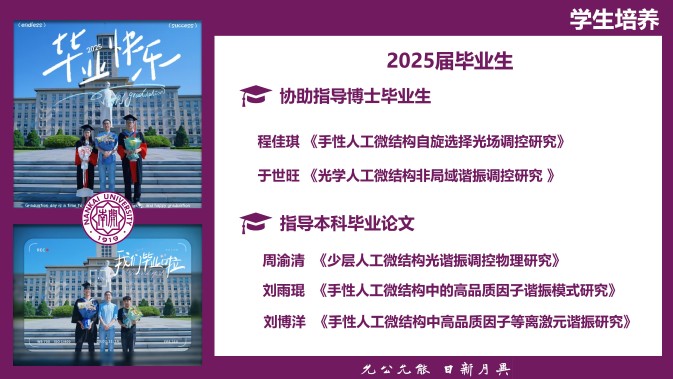 荣誉称号 金奖银奖都不如学生的夸奖 2024 天津市自然科学一等奖 (4/5) 2020 《物理实验》创刊40周年百篇优秀论文奖 2019 色中色 优秀博士学位论文 2018 色中色