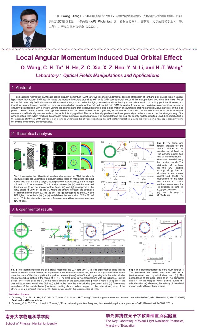 On Dec. 30th, 2022, the 2022 Annual Academic Conference of the School of Physics of Nankai University was held online. The school continued its tradition of collecting posters of graduate students for evaluation, aiming at training graduate students’ abilities to sort out and refine scientific research papers and improving their academic writing abilities. Ten students, Kaixuan Huang, Jiaxin Yang, Lun Qu, Qiang Wang, Yuhui Zhuang, Tengjiao Wang, Tao Wang, Caiyan Zheng, Xu Sang and Zepeng Sun, won the Outstanding Academic Achievement Award through the selection by the school.